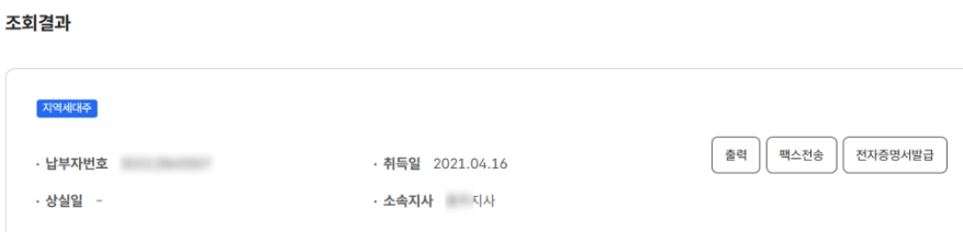조회 내역은 위와 같으며 출력, 팩스 전송, 전자 증명서로 활용할 수 있어요!