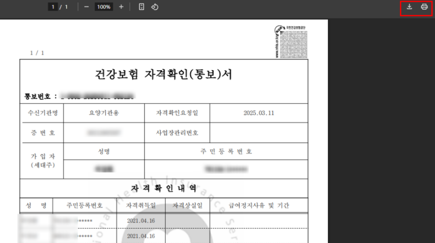 이렇게 내용을 확인하신 후에는 저장 및 출력을 통해 건강보험료 자격확인서 발급을 완료하실 수 있다.