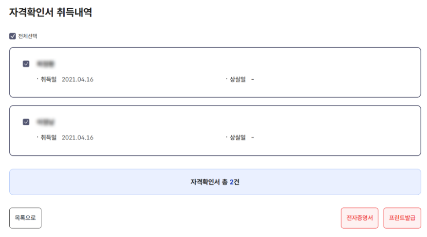 내용을 확인 한 후 아래로 스크롤을 내리면 건강보험 자격확인서를 총 2건 조회할 수 있습니다. 이를 전자증명서로 활용하거나 출력을 통해 인쇄 또는 PDF 파일로 저장하여 이용 가능합니다.